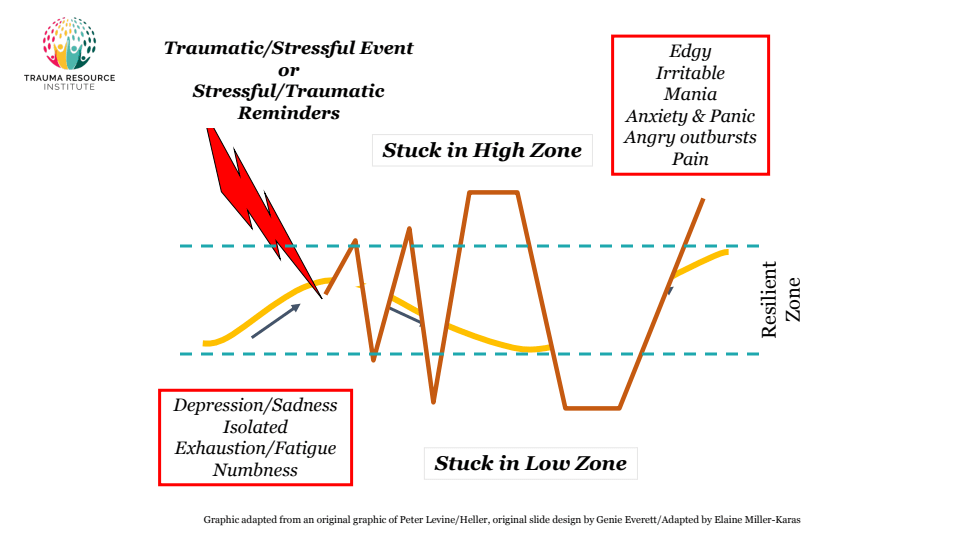 Figura 2. Diagramma della “Zona di Resilienza” (fascia centrale) rispetto agli stati di iper-attivazione bloccata (High Zone, in alto) e ipo-attivazione bloccata (Low Zone, in basso). Quando operiamo entro la nostra zona resiliente, mente, corpo e spirito sono in uno stato di benessere e flessibilità. Eventi di vita stressanti possono farci uscire temporaneamente dalla zona (linea che esce dai margini), ma con le giuste abilità possiamo recuperare l’equilibrio. Grafico adattato dal Trauma Resource Institute (credit: E. Miller-Karas, ispirato ai lavori di Levine/Heller).